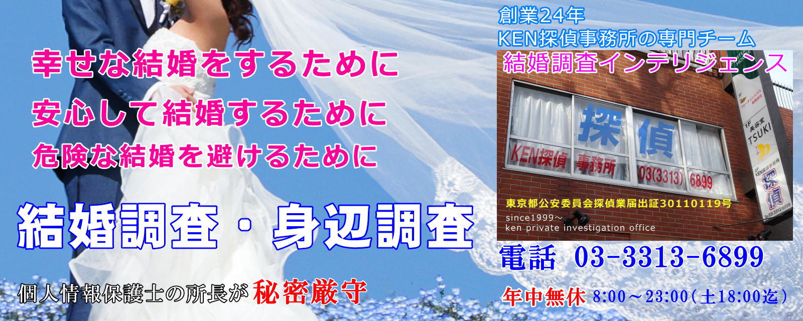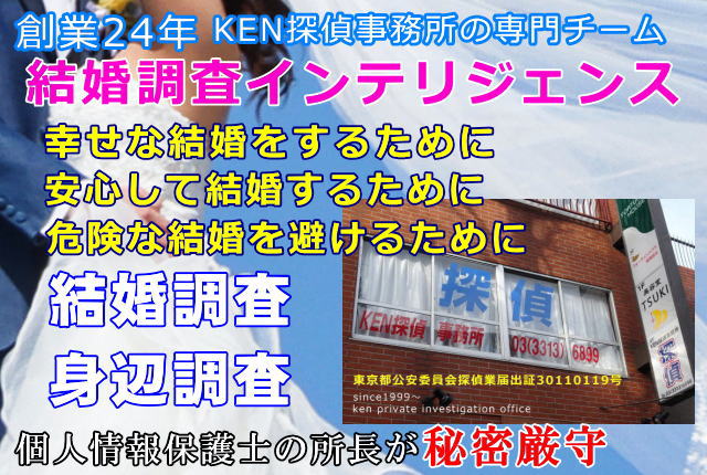 「安心したい」「事実を知りたい」「信頼できる東京の結婚調査専門探偵に依頼したい」――そんなあなたのために、KEN探偵事務所の結婚調査専門チーム『結婚調査インテリジェンス東京』がお応えします。